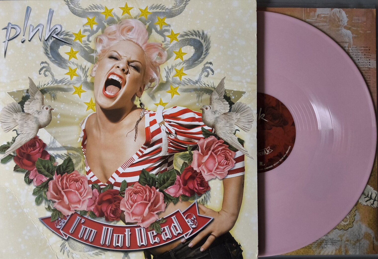 Album Cover, showing P!nk with pink hair, a T-shirt with red and white stripes and black trousers. She's shouting. The picture also shows a pink record.