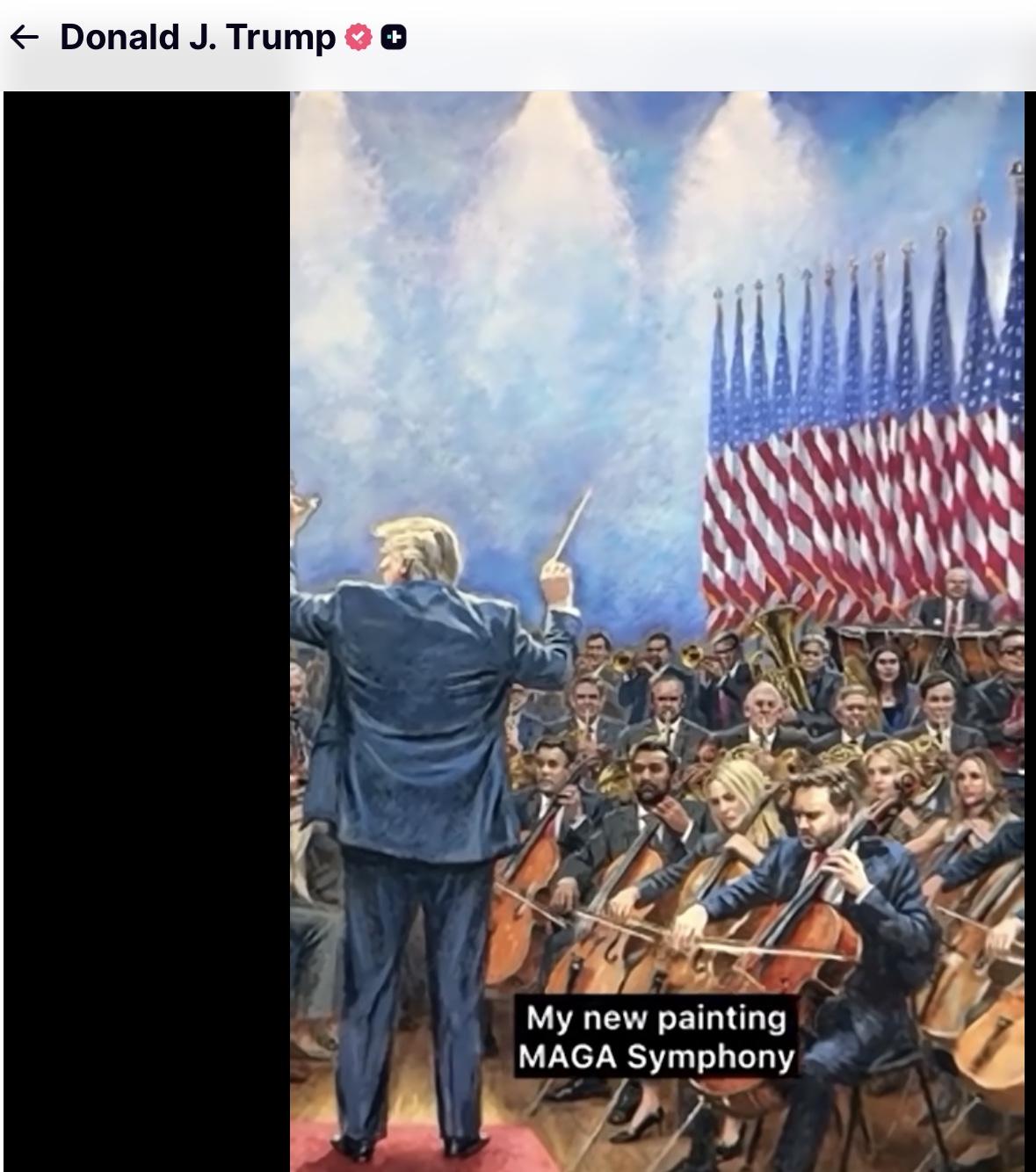 The music of the legendary Freddie Mercury [who should be rising from his grave at this desecration] being used to pan across ‘My New Painting’. The sound and song ‘Who Wants To Live Forever’ plays as the camera pans across Trump conducting this ‘orchestra’