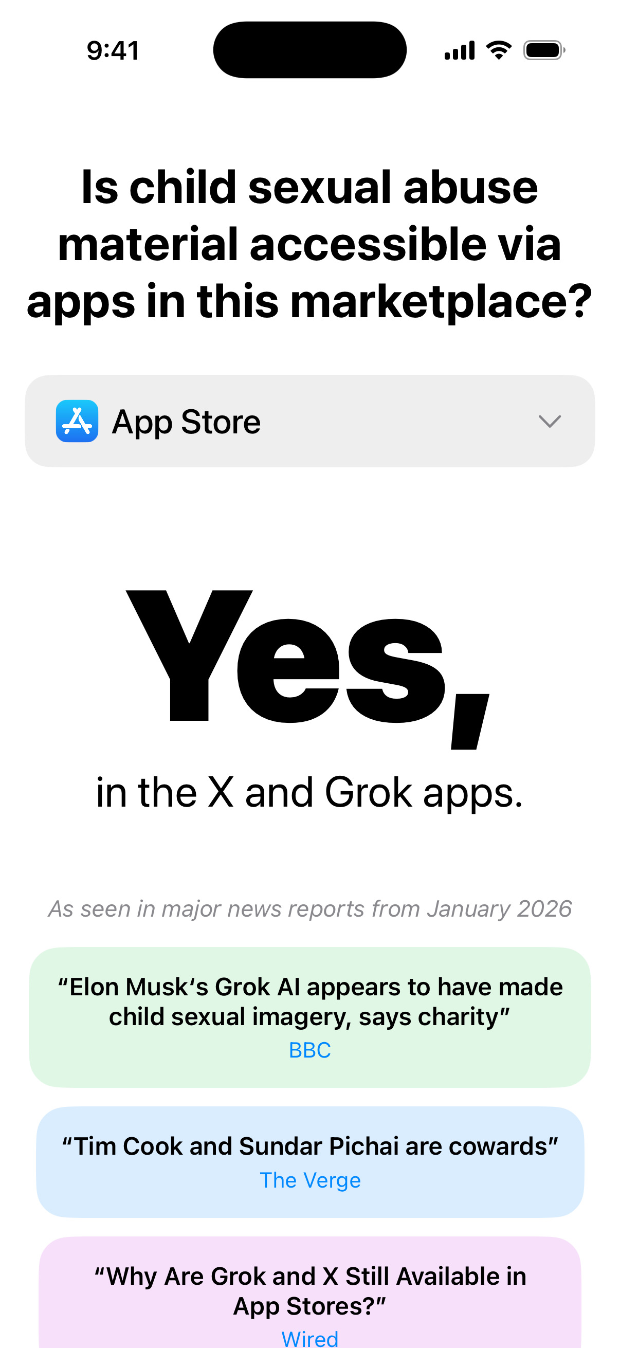 Quickly check if a given app marketplace has apps available that are currently distributing CSAM and find related news articles. Choose from our list of four marketplaces to get a simple Yes or No answer that makes it easy to know where CSAM is being shared.