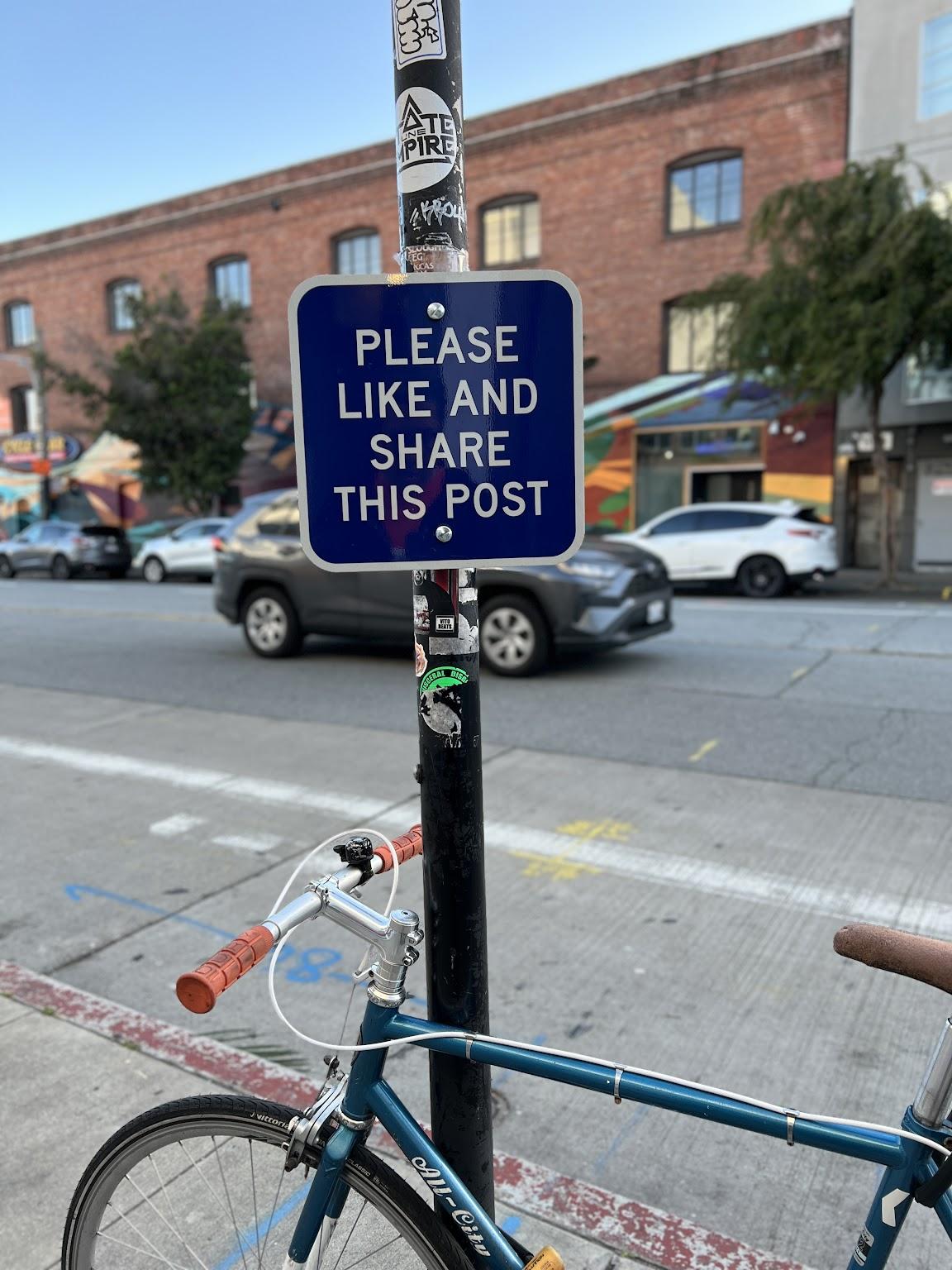 @ascentale @bikenite A8: this last week wasn't anything unusual but did go to First Thursdays art walk last night which was fun. As far as a photo - this one was in my camera roll of a funny sign in SOMA #BikeNite