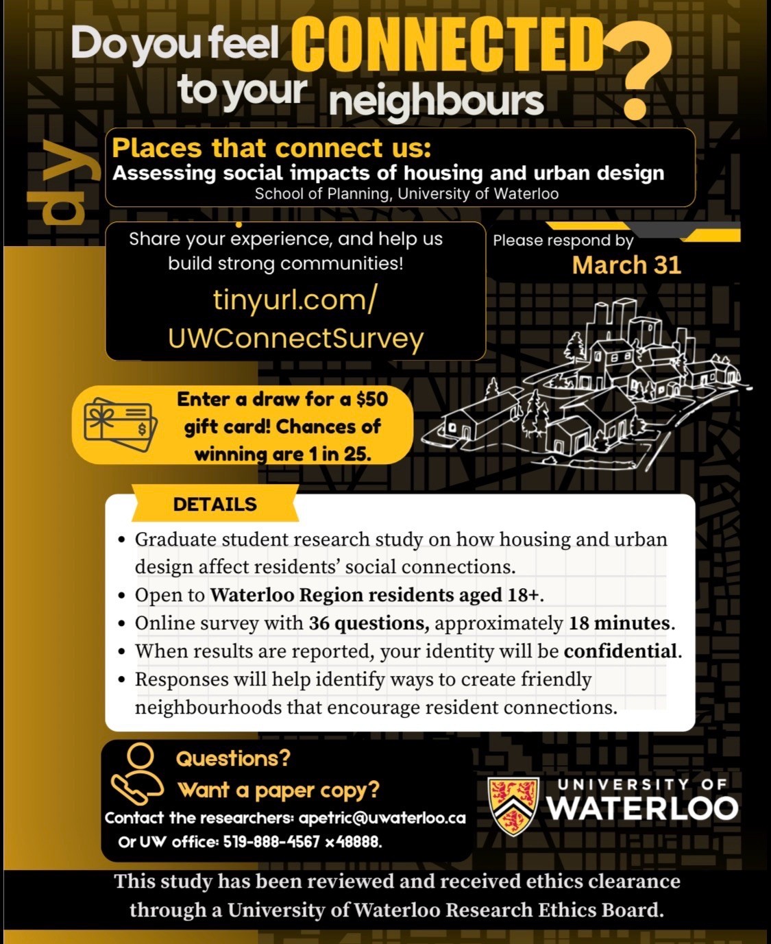 How does housing and urban design affect our social connections? Fill out this survey from the University of Waterloo’s school of planning to help researchers find out! Participants can enter a draw for a $50 gift card.