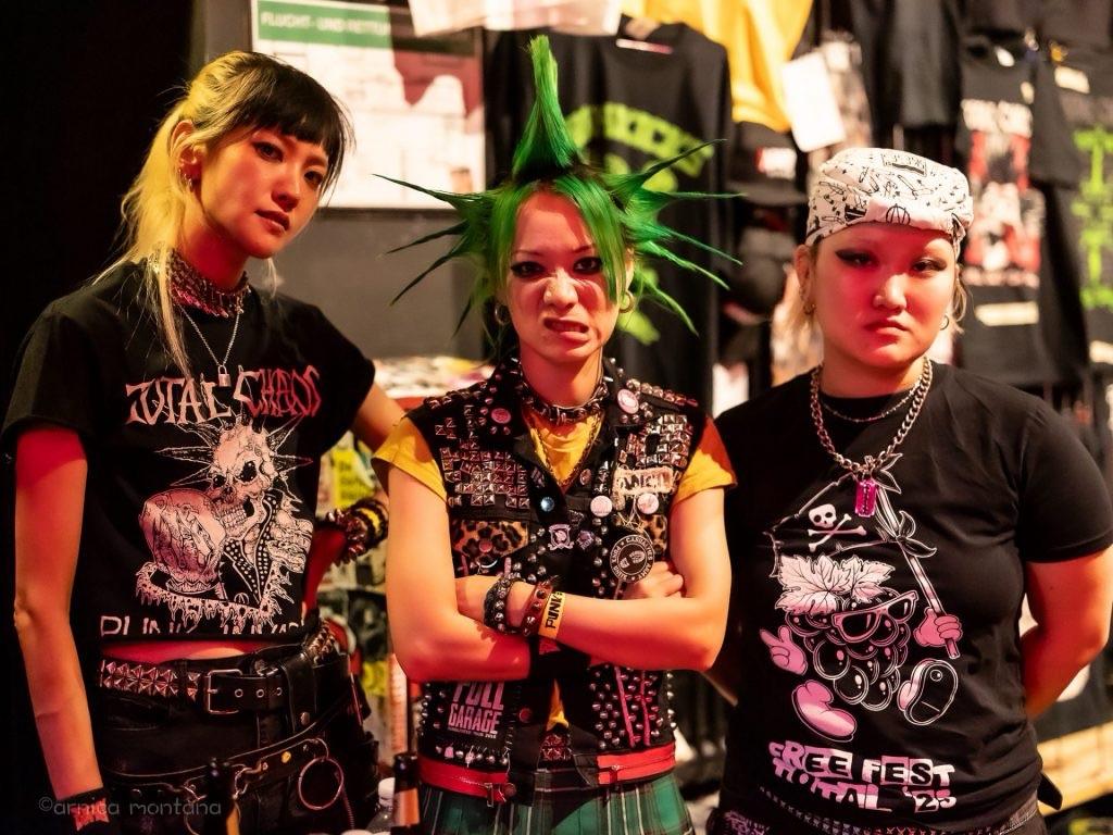 Three young women with punk aesthetics pose confidently. The first has long dark hair and wears a black band T-shirt. The second features vibrant green spiked hair and a spiked vest. The third has a bandana and a graphic T-shirt.