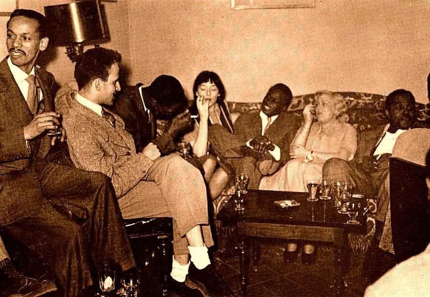 Paris 1949. (L-R) Tommy Potter, Boris Vian, Kenny Dorham, Juliette Greco, Miles Davis, Michelle Vian, and Charlie Parker.