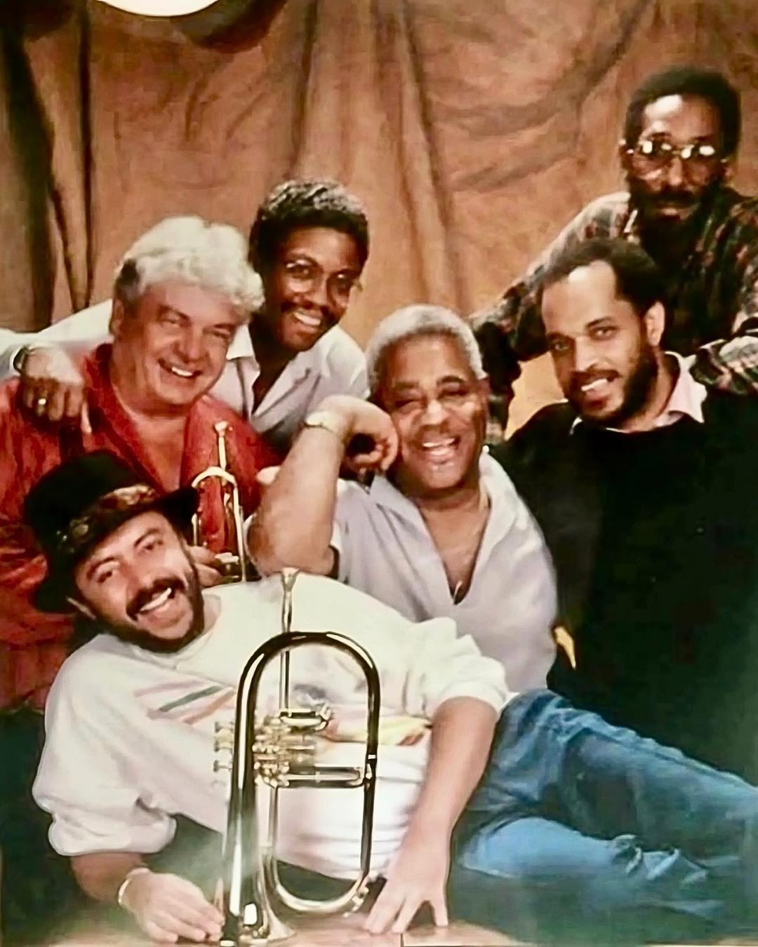 Chuck Mangione (bottom), Maynard Ferguson (left), Herbie Hancock, Dizzy Gillespie (middle), Billy Higgins, and Ron Carter