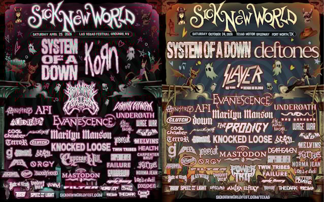 System Of A Down and KoRn will return to Sick New World Las Vegas, taking place at the Las Vegas Festival Grounds on April 25, 2026. The staggering lineup features additional performances from Bring Me The Horizon, Evanescence, Marilyn Manson, Danny Elfman, Knocked Loose, Ministry, AFI, Cypress Hill, Acid Bath, and many more. Fans can