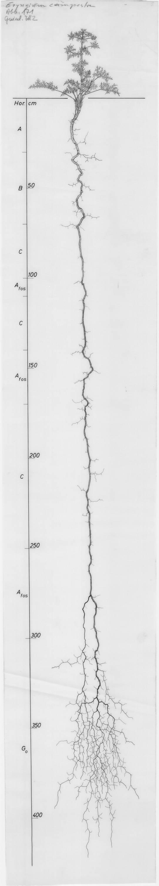 A drawing of a plant's root system from the linked website. - plant height: 40 centimeters / 15.7 inches - root depth: 459 centimeters / 180.7 inches - root system diameter: 48 centimeters / 18.9 inches