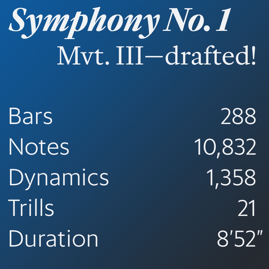 Finished the first draft of the 3rd movement (out of 4 planned) of my #symphony today. That’s a really good feeling. I still have an enormous amount to do—each of the first three movements needs some revision, Mvts. 2 and 3 especially! But it’s a good progress marker. Onward! #music #orchestra