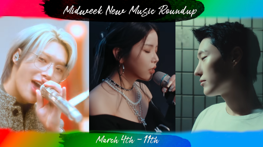 In a distressed frame (top and bottom bars only, red to blue left to right gradient), three screenshots. Leftmost, a young Korean man with silver hair (Mingi of ATEEZ) wears wire rim glasses and a moss-grey tweed jacket and holds a silver mic up close to his mouth while singing. In the center, a young Korean woman with long black hair pinned back and wearing an off-the-shoulder black sweater, several pearl necklaces adorning her neck and chest (Solar of MAMAMOO), stands in right-facing profile while singing into a stand mic she holds with both hands, her eyes closed. Rightmost, a young Korean man with short black hair and a plain white shirt (soloist WOODZ) stands in left-facing profile, eyes nearly closed as he considers something unseen. Title text reads Midweek New Music Roundup. Bottom text reads March 4th - 11th.