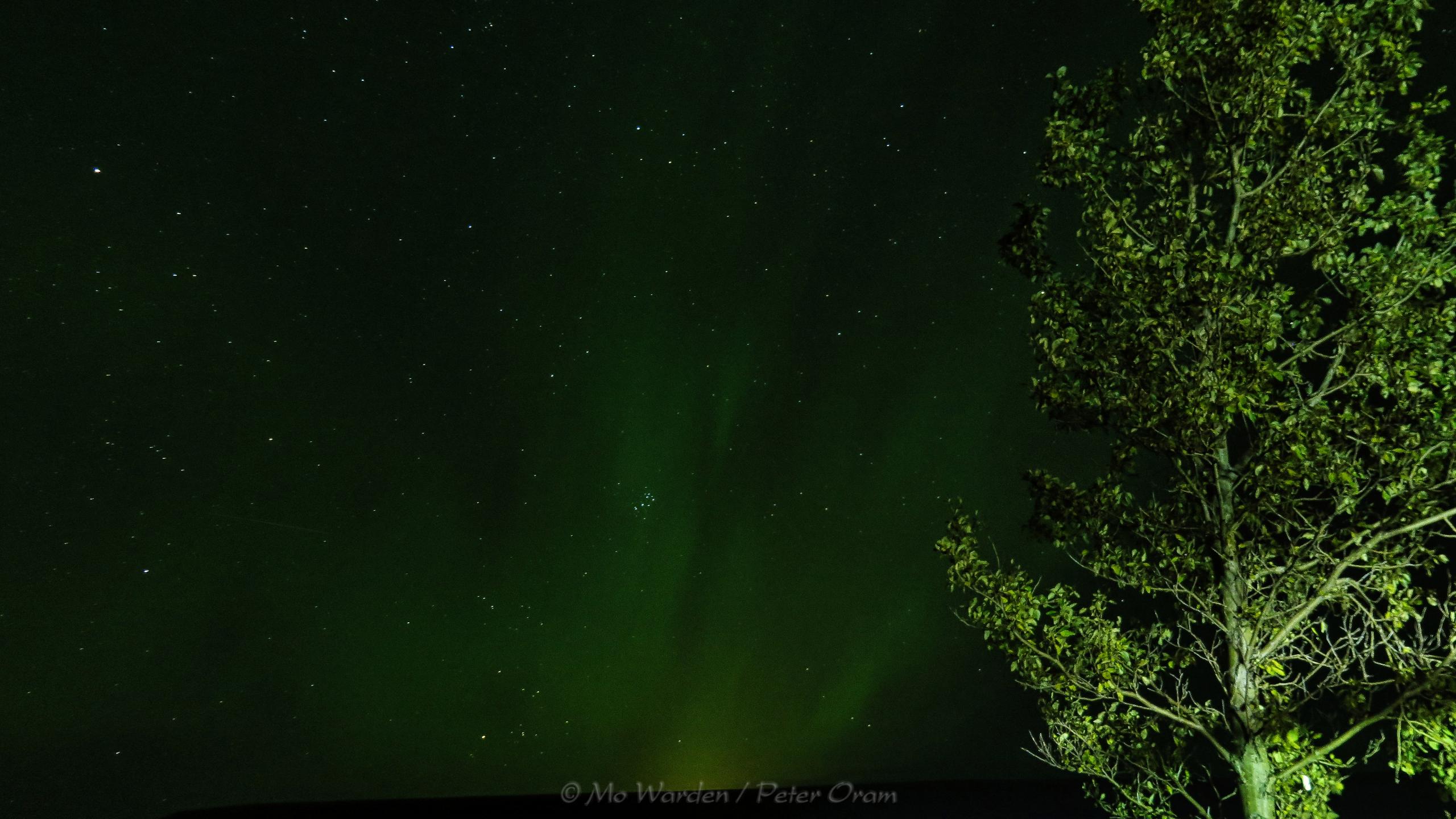 Second photo is a slightly wider view, taken in full night. The tail extends at least seven degrees. The sky background is mottled and banded. That's because bands of (mostly green) airglow were drifting across the sky.