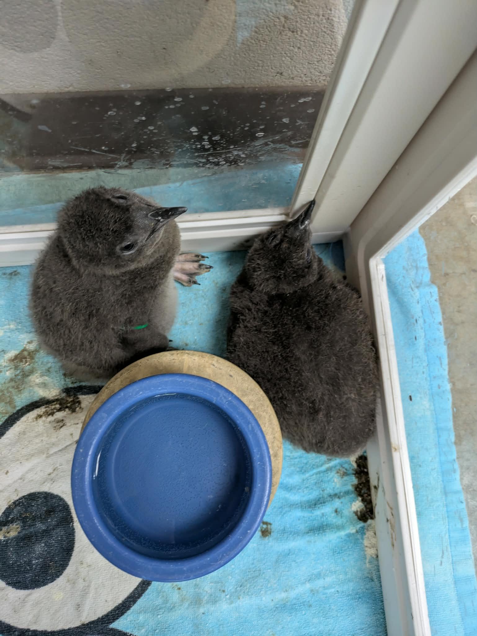 A top-down view of two charcoal grey penguin chicks sitting in the corner of their pen. The floor of the pen is covered in a fluffy blue towel with a bit of bird poo on it. There's a clean bowl of water available. The chicks are both looking out through the glass walls. They are adorable and incredibly fluffy looking, each about the size of a large mango. They have black beaks and eyes, and we can see one foot peaking out from underneath the sitting one, displaying light grey toes with black talons. The other chick is laying on its stomach looking out..