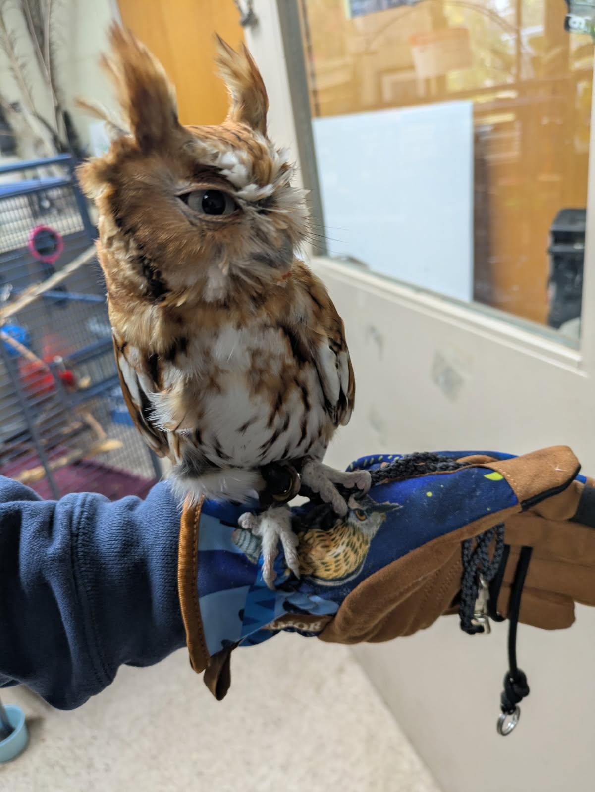 A similar image to the previous one, but now Beans is looking to the right (away from the person whose arm he's sitting on) presumably towards the baby penguins. He still looks like the most offended owl in the whole universe. His ear tufts are straight up and he's leaning slightly backwards, away from the chicks down the hall.