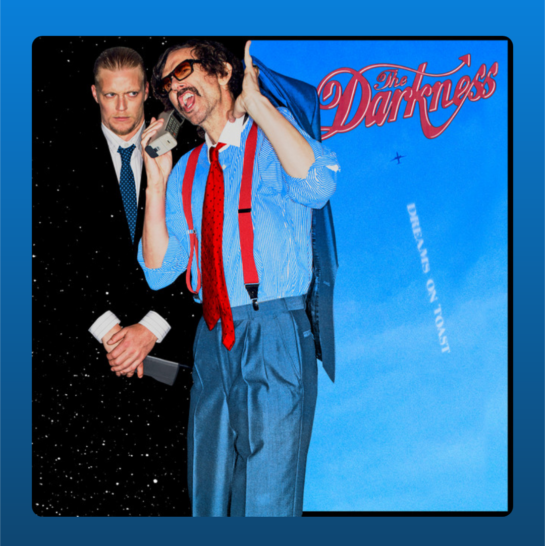 Album cover for Dreams on Toast by The Darkness. It shows two men in suits against a surreal background that blends outer space and a bright blue sky. The man in front, wearing red suspenders, a blue shirt, and a red tie, shouts into a large vintage mobile phone while holding a suit jacket over one shoulder. Behind him, another man in a dark suit and tie looks on sternly, holding two white cups. The band’s name, ‘The Darkness,’ appears in stylized red script in the top right, and the album title ‘Dreams on Toast’ is written vertically in light blue letters.