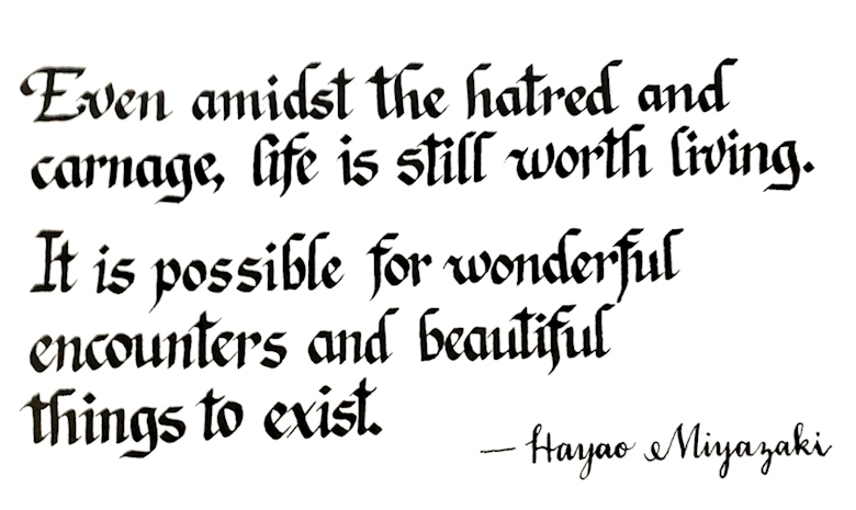 “Even amidst the hatred and carnage, life is still worth living. It is possible for wonderful encounters and beautiful things to exist.” —Hayao Miyazaki