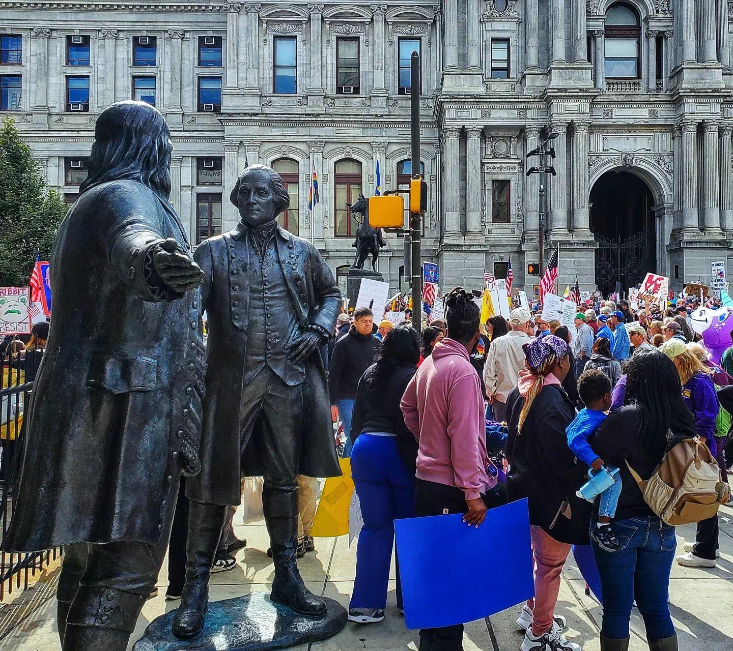 #NoKings #NoKingsPhilly #Philly #JimWest #art #sculpture #Philadelphia #BenFranklin #GeorgeWashington #CityHall #Protest #WeThePeople