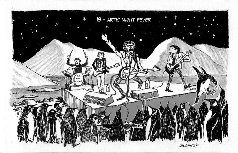 19 - Artic #Inktober #Inktober2025 #Articmonkeys #penguins #rock #livemusic #nighlifte #articnight - rock band inspired from a picture of the Artic Monkeys' live at The Royal Albert Hall. Post edits with drawing tablet and sketchbook.
