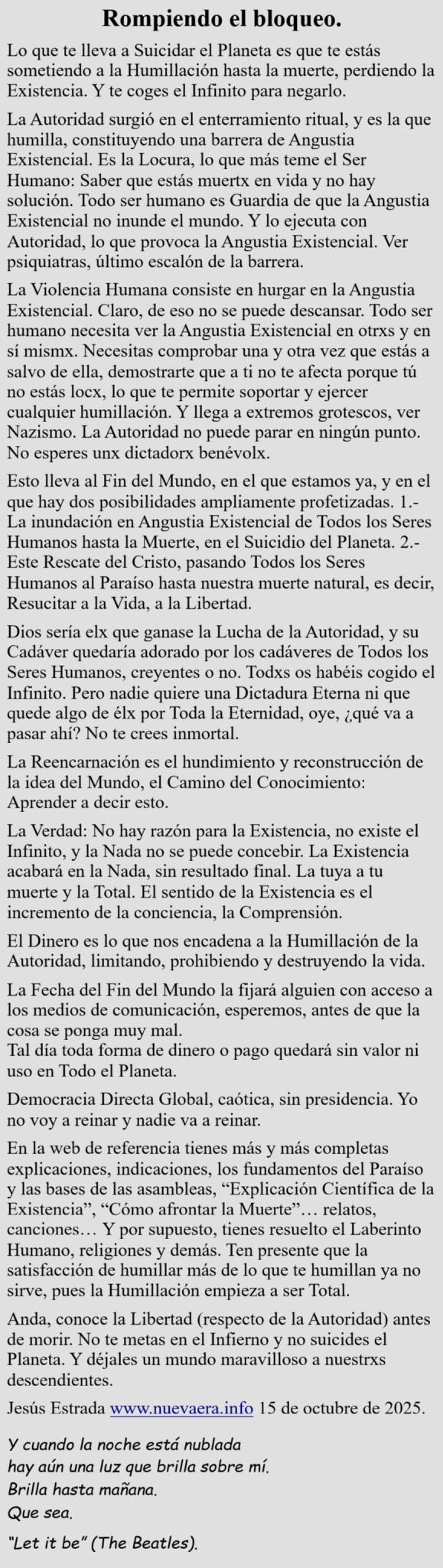 Efectivamente, el bloqueo está en la Angustia Existencial, provocada por la Autoridad. Sí, estoy recordando toda mi vida y todo cobra explicación. Tremendo.