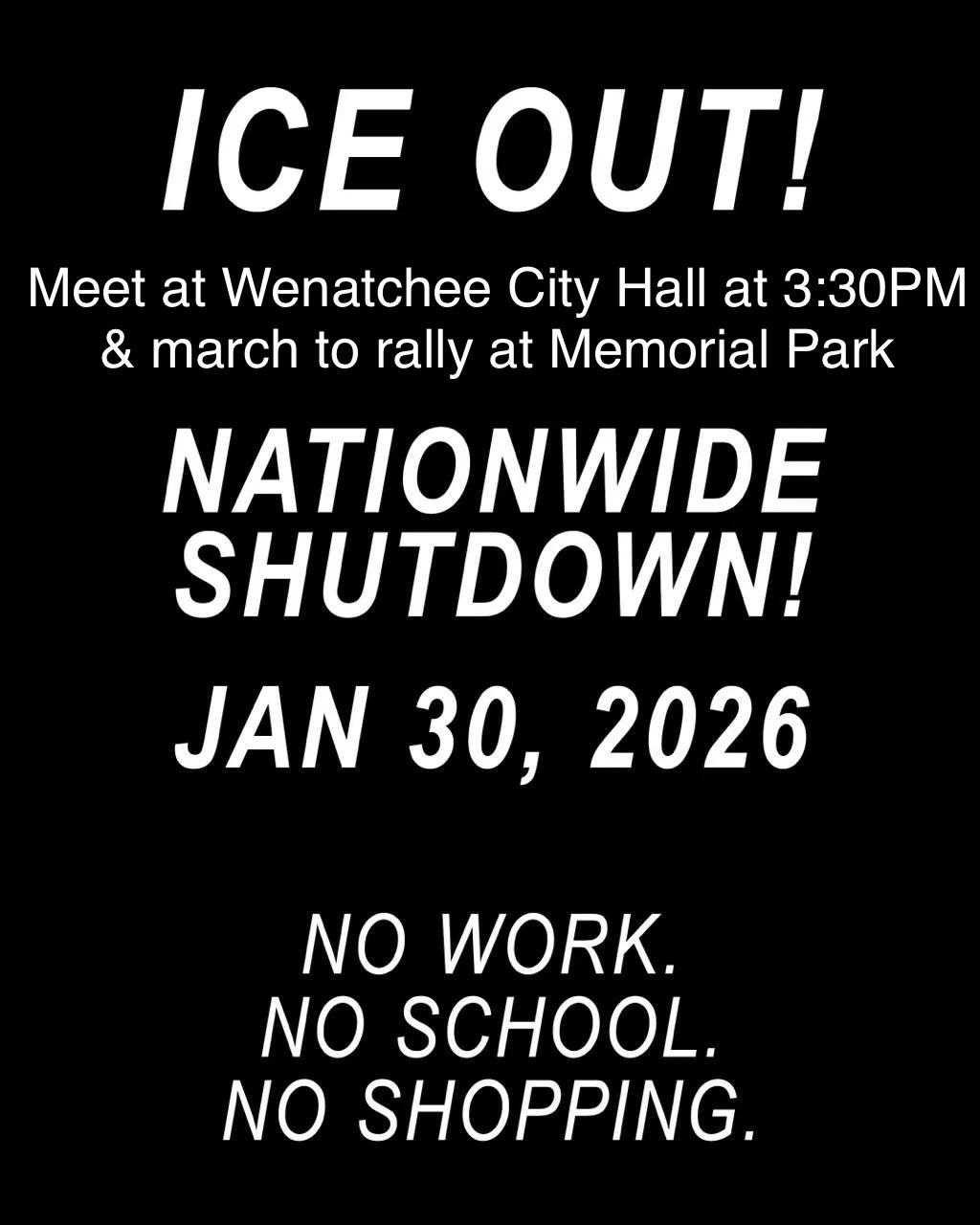 White text on black background. ICE OUT! Meet at Wenatchee City Hall at 3:30PM & march to rally at Memorial Park NATIONWIDE SHUTDOWN! JAN 30, 2026 NO WORK. NO SCHOOL. NO SHOPPING.