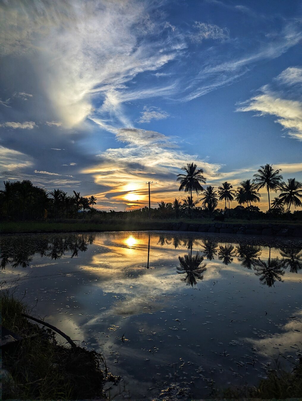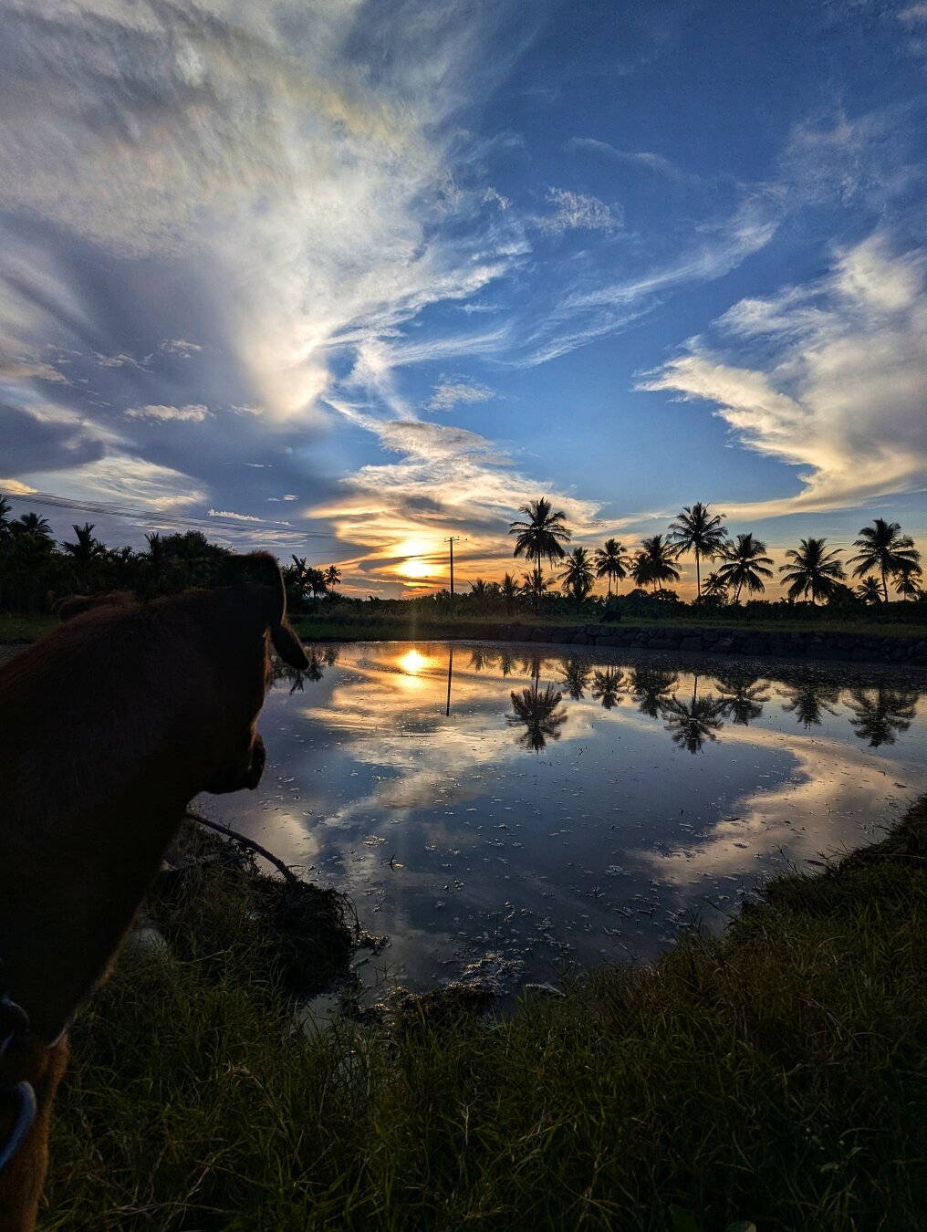 Peaceful Evening🌥️ #pixelfed #pixel7 #teampixel #shotonpixel #water #reflections #sun #clouds #coconutree #blue #orange #fedipic #dog #walking #dusk #sunset #golden #hour