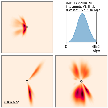 1️⃣ S251013x on 13 October at a distance of around 12 billion light-years. If the masses of the two black holes were equal, they were between around 25 and 100 solar masses. More info: https://gracedb.ligo.org/superevents/S251013x/view/
