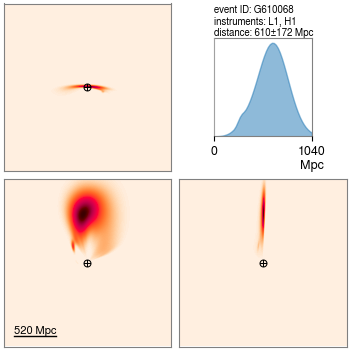 Four diagrams showing two-dimensional slices through the three-dimensional position probability distribution of the candidate S251014cn.