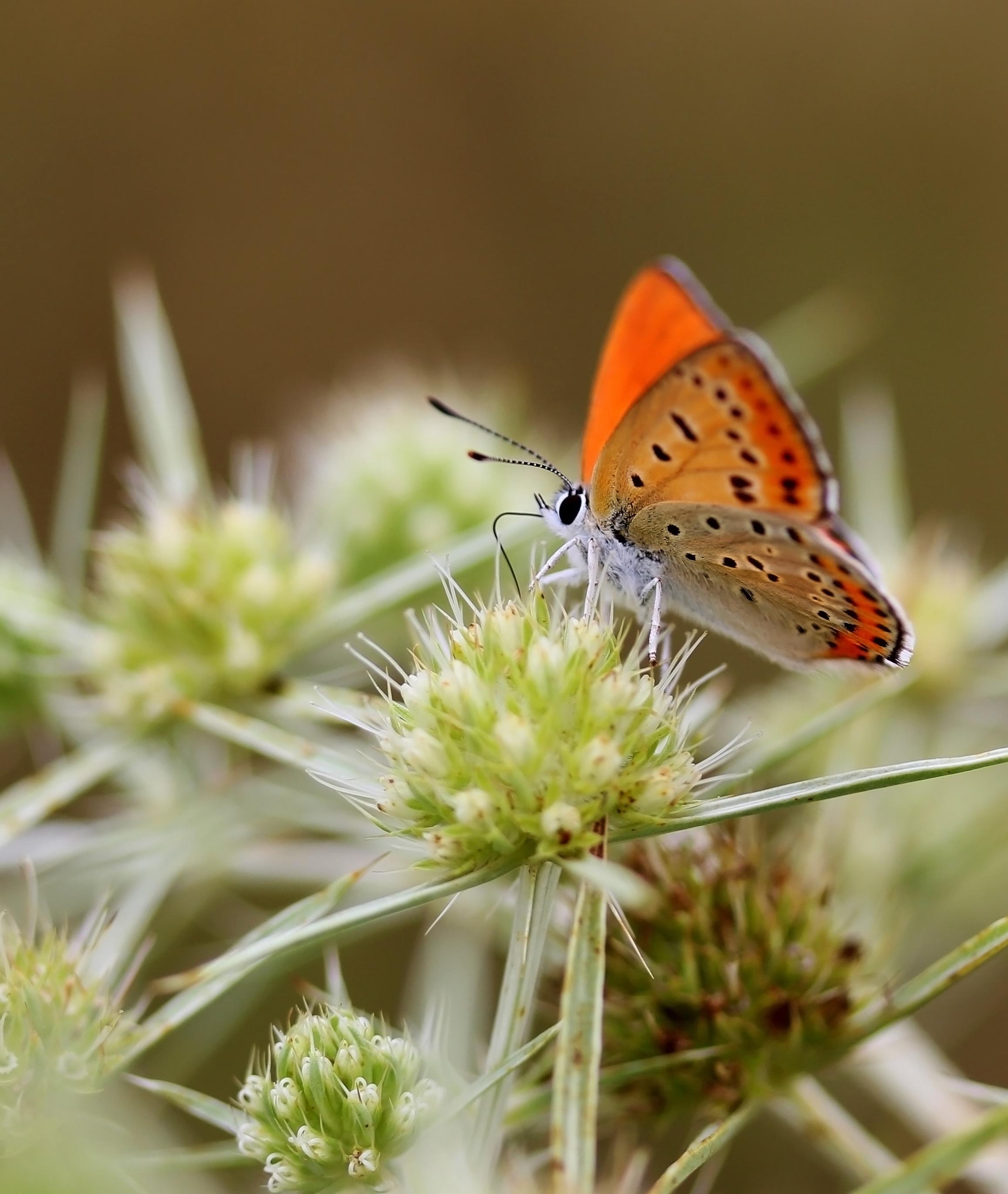 Small Copper butterfly or American Copper (Lycaena)...known to be very territorial, they've been seen chasing birds away ....to attract to your yard...their caterpillars feed primarily on Sorrel and Dock plants (Rumex species). #insects #butterfly #nature #biology #photo