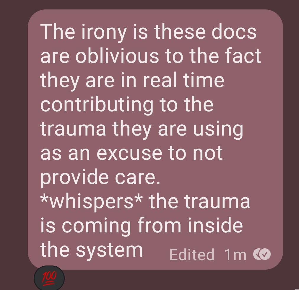 Text bubble with: "The irony is these docs are oblivious to the fact they are in real time contributing to the trauma they are using as an excuse to not provide care. *whispers* the trauma is coming from inside the system" and a friend has dropped a 100% emoji on it.