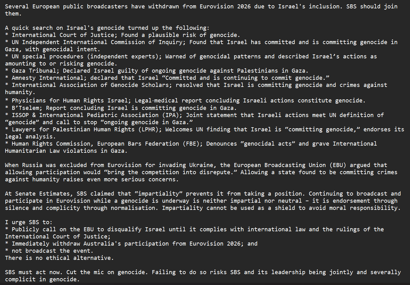 Text of my email to SBS management.