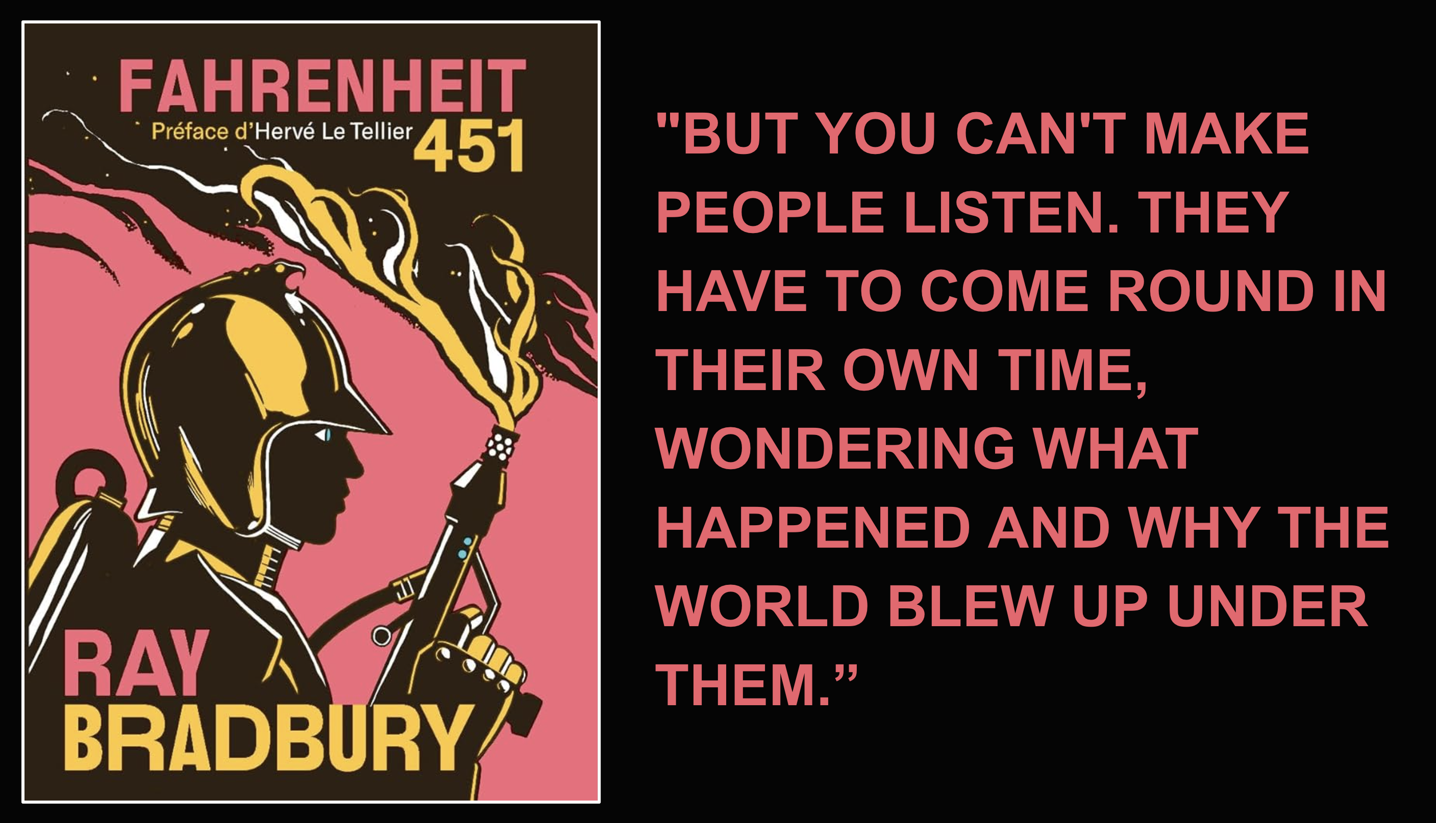 Cover of Ray Bradbury's Fahrenheit 451 w/ quote ""BUT YOU CAN'T MAKE PEOPLE LISTEN. THEY HAVE TO COME ROUND IN THEIR OWN TIME, WONDERING WHAT HAPPENED AND WHY THE WORLD BLEW UP UNDER THEM.”"