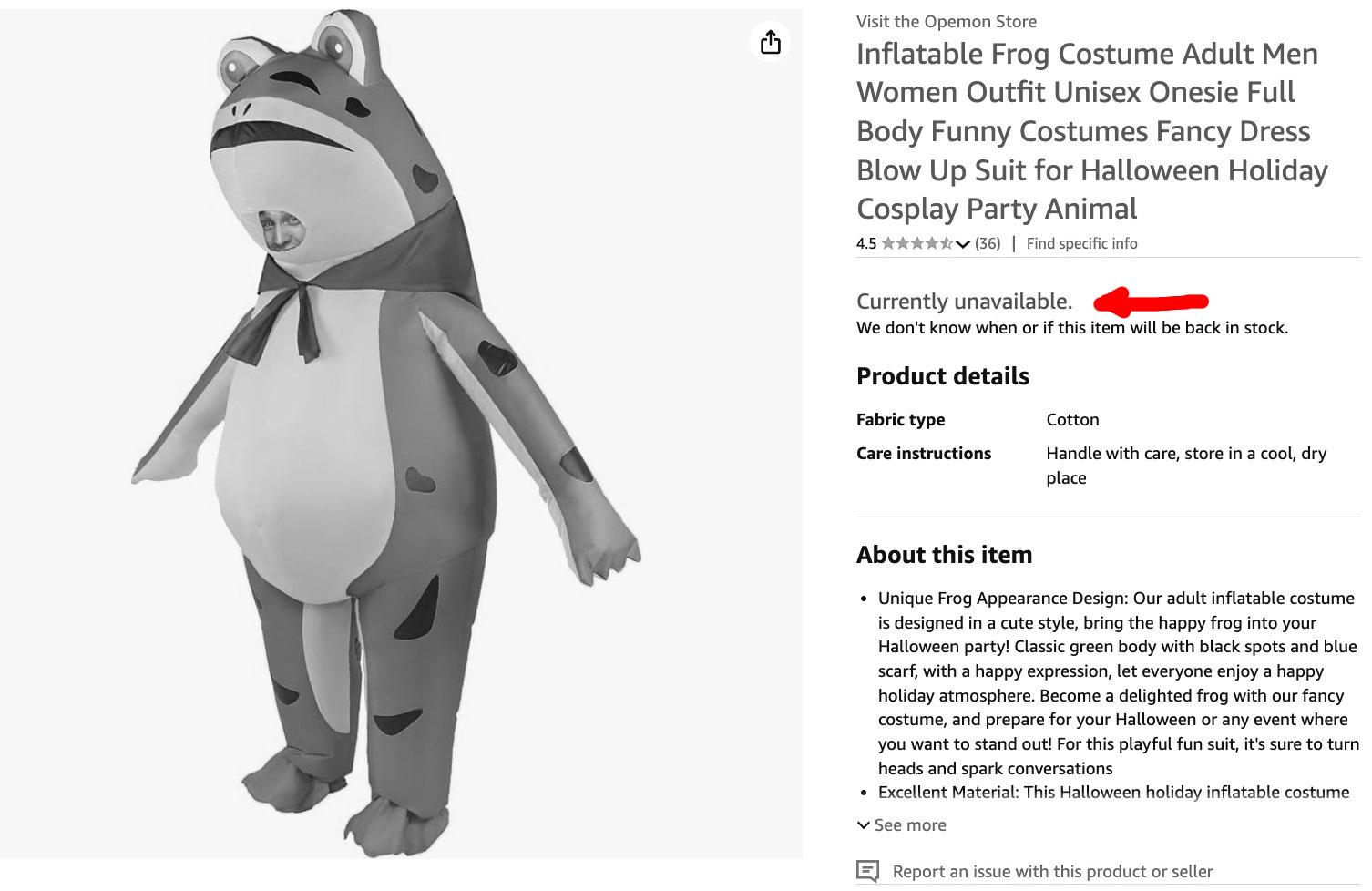 alt Screenshot eines Frosch-Kostüm Artikels auf der amerikanischen Amazon-Seite. Der Artikel ist aktuell ausverkauft. Screenshot eines Frosch-Kostüm Artikels auf der amerikanischen Amazon-Seite. Der Artikel ist aktuell ausverkauft.