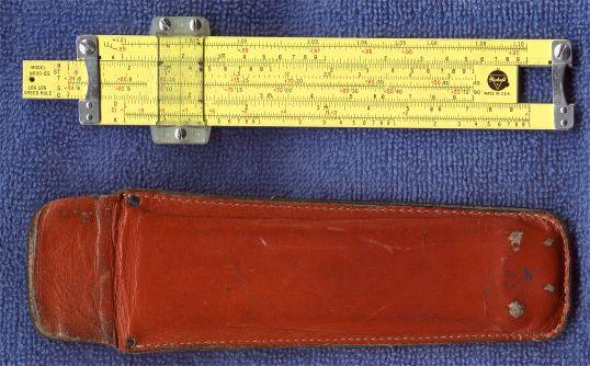 Photo of a Pickett N600-ES slide rule, yellow with black and red scales, shown above its brown suede leather case https://www.sliderule.ca/pi600f.jpg